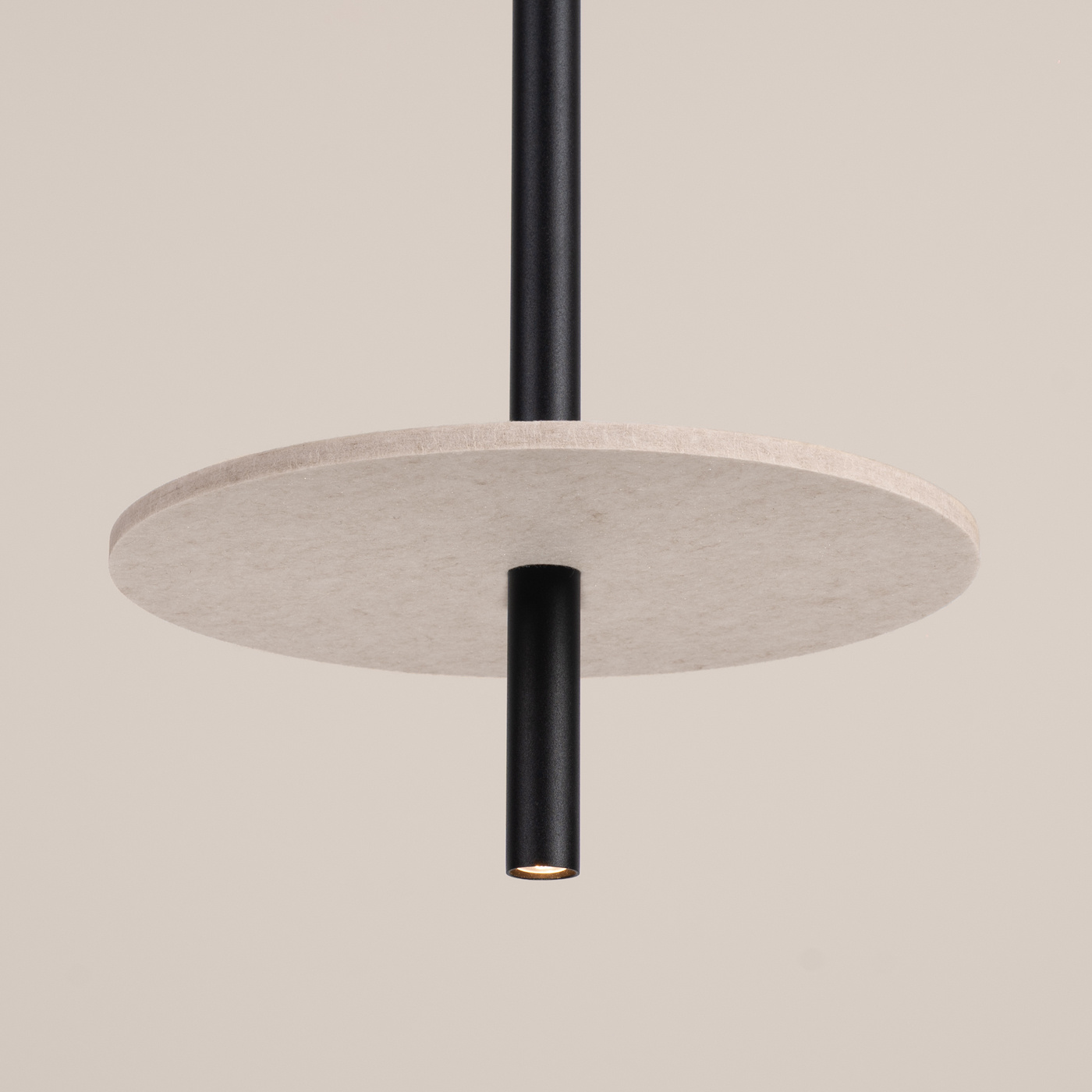 FELTRO är en lampa som kombinerar estetik med funktionalitet. Den filtade skivan utgör ett uttrycksfullt dekorativt element, och stålröret möjliggör flexibel höjdjustering, vilket gör att lampan passar i alla rum, oavsett storlek.