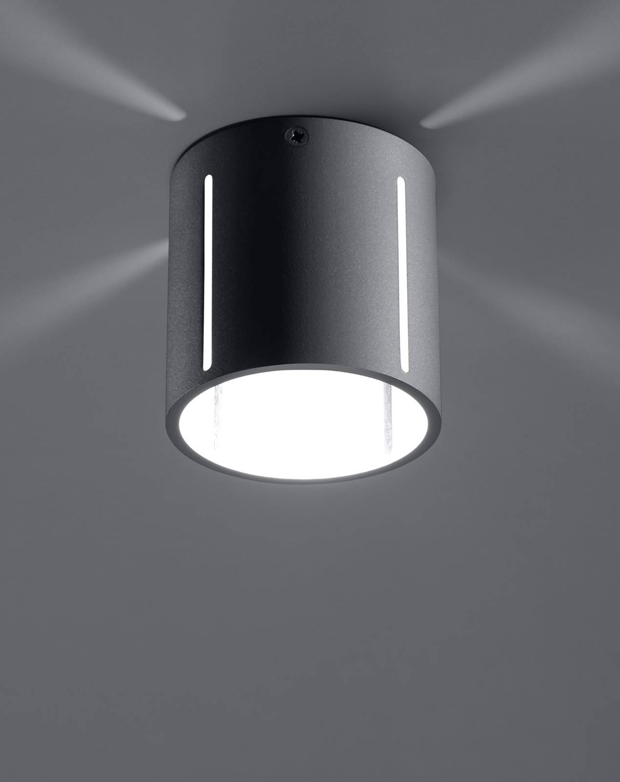 Plafonden INEZ lyser nedåt, men skenet sipprar också ut genom de linjära perforeringarna i diffusorns sidoväggar. När du tänder den förvandlar du hela taket till en slående dekoration.